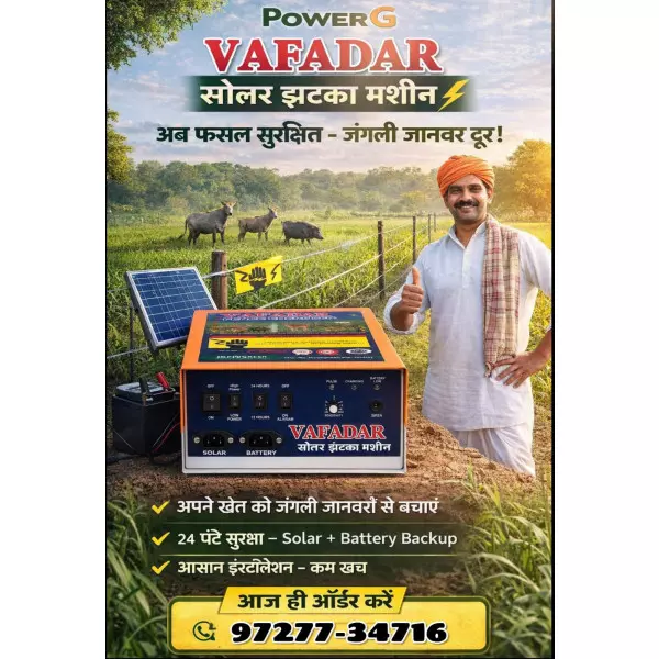 1. Designed As Per BIS Standards Given By Govt. Of India2. Solar Charging Available.3. 60 Acre Area Coverage.4. 12 Ah Battery Inside5. Reverse Battery Protection Available.6. Best Quality With 10000 V Power.7. Day Night Mode Available.8. Fence Fault Siren Available.9. Heavy MS Cabinet.10. Best Packing With Thermo Coal Coating.... Read more