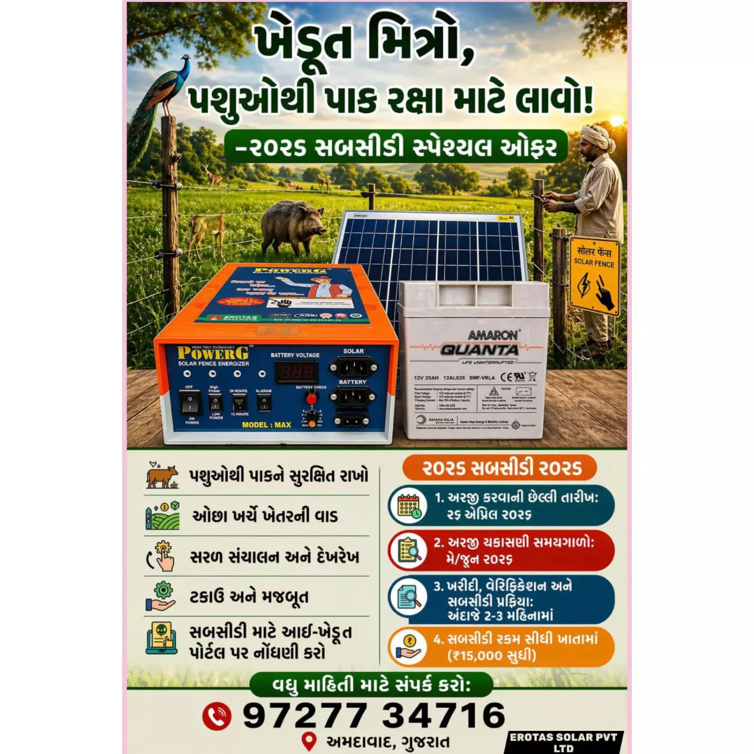 1. Designed As Per BIS Standards Given By Govt. Of India2. Solar Charging Available.3. 60 Acre Area Coverage.4. 12 Ah Battery Inside5. Reverse Battery Protection Available.6. Best Quality With 10000 V Power.7. Day Night Mode Available.8. Fence Fault Siren Available.9. Heavy MS Cabinet.10. Best Packing With Thermo Coal Coating.... Read more